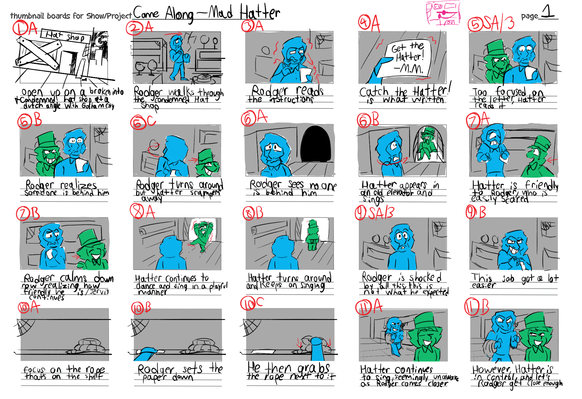 Thumbnail Storyboards for an upcoming fan animatic of Batman! It stars Mad Hatter, Batman, and my original character, Rodger.